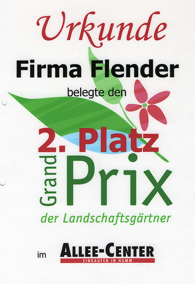 Als ehemaliger Geschäftsführer der Firma "Flender GmbH" und jetziger Alleinunternehemer der Firma "Garten Design - Achim Bahne" erlaube ich mir, auch auf diesen gewonnenen 2. Platz hinzuweisen.